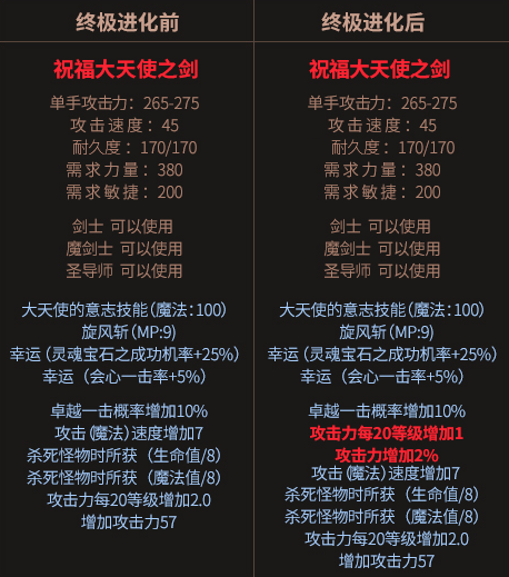 功能介绍: 通过消耗道具,积分及另一件相同加15追16的祝福大天使武器,将1件+15追16的祝福大天使系列武器进化为终极形态。 进化规则: - 被进化装备要求:任意2件相同职业+15追16的祝福大天使武器 - 进化后大天使终极型态:在原祝福大天使武器的所有属性基础上再增加2个专属卓越属性 - 进化后装备强化及追加等级:强化和追加等级均为0。 注意事项: 1、进化时联系客服,帐号必须处于离线阶段 2、将第一页仓库清空后 把所需进化的所有道具物品放在仓库上方。 3、需要进化的武器放在仓库左上方,切账户下留有20万以上的积分。 4、进化完成之后无法逆转,请谨慎操作 终极进化功能消耗: - 点数消耗:200000 点积分 - 道具消耗:大天使的铁锤*4 注:终极祝福大天使的武器(无级别限制)大于或等于1000级武器(分职业),但小于1100武器。 附图: